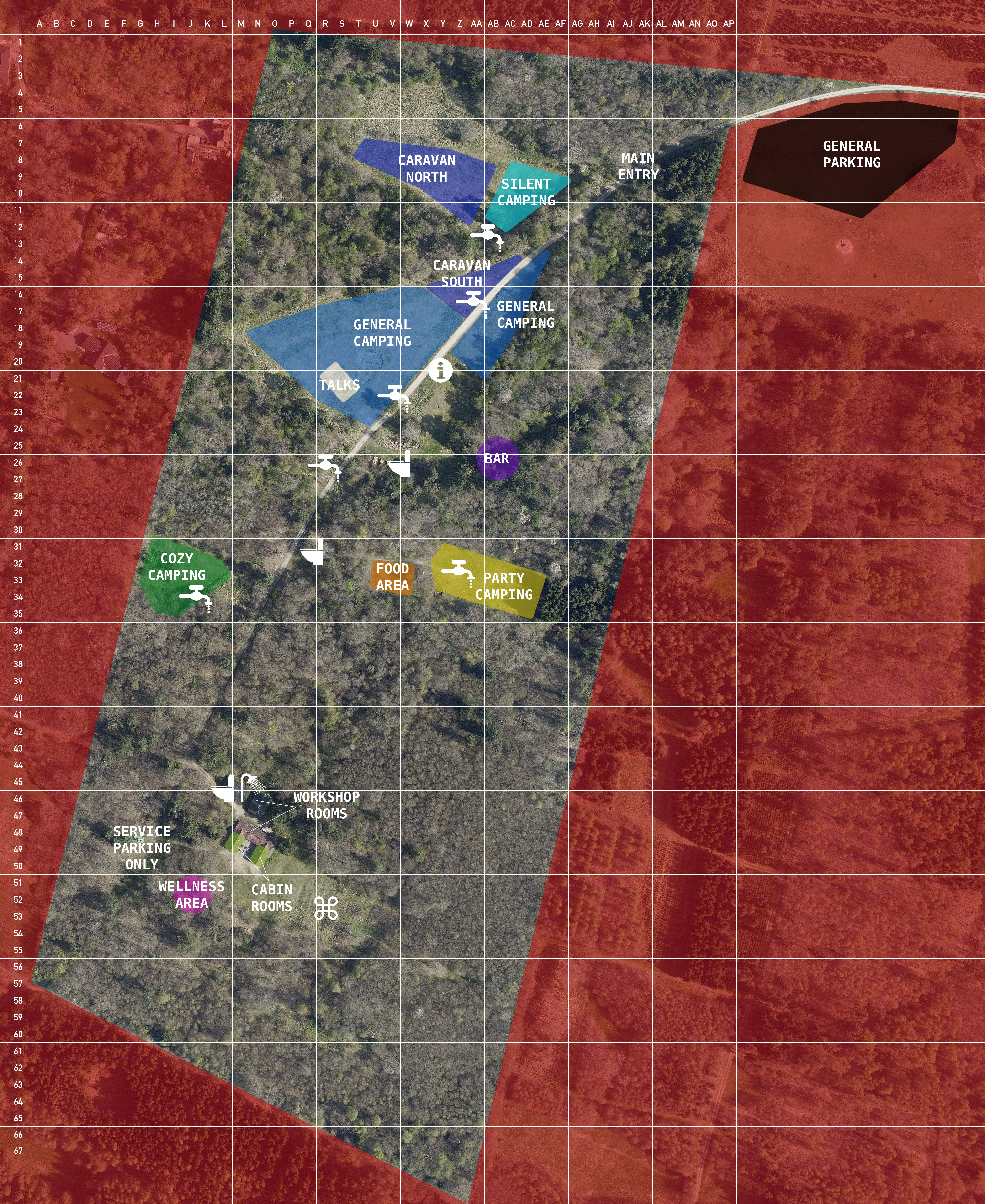 There is also an area designated for caravans next to the silent area from T8 to Y8. This area should follow the same guidance as the quiet area in regards to noise. - The purple area in the middle of the map around AB26 is the bar.